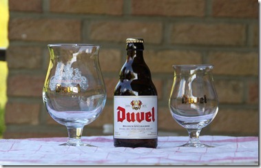 Duvel の瓶とグラス・・・左は通常のグラス、右の小さいのは、たまたま先週、酒屋へ行ったら無料で頂いてきたサービス品・・・、以前から時々目にしていて、「欲しいなぁ~」と思っていた品である・・・ラッキー!