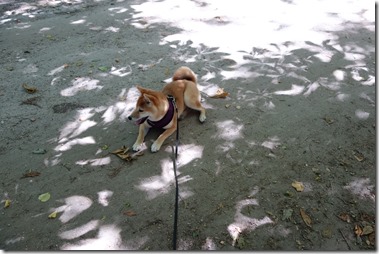 遊歩道の木漏れ日の中でまどろもうとするMomoだが、ここは歩道の真ん中だぞ! ・・・ それにしてもこの木漏れ日のシルエットが濃淡がついて、とても綺麗だった。