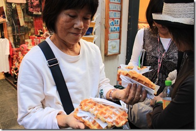 近くにあったワッフル屋の棚には興味をそそる陳列が・・・、ベルギーでワッフル、やっぱり食べたいよねぇー。